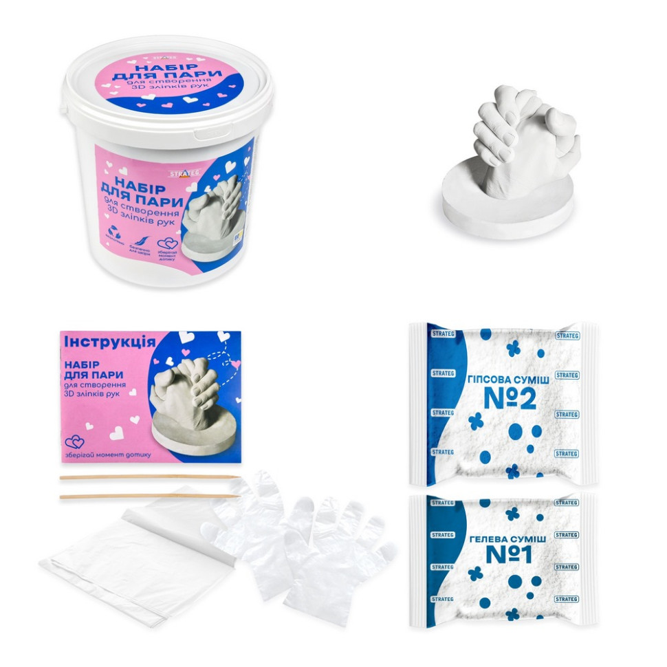 Набор для пары для создания 3D слепков рукНастоящее чувство - это то, которое хочется сохранить навсегда. Этот набор позволяет создать парный объемный слепок рук как символ близости, доверия и тепла. Идеальный подарок на годовщину, помолвку или просто потому, что вы рядом.♦ Комплектация: Комплектация: ведерко-упаковка (изготовлено из пластика), гипс, гелевая смесь, деревянные зубочистки - 2 шт., одноразовые перчатки - 1 пара (изготовлены из полиэтилена), инструкция (изготовлена из бумаги), скатерть - 1 шт.