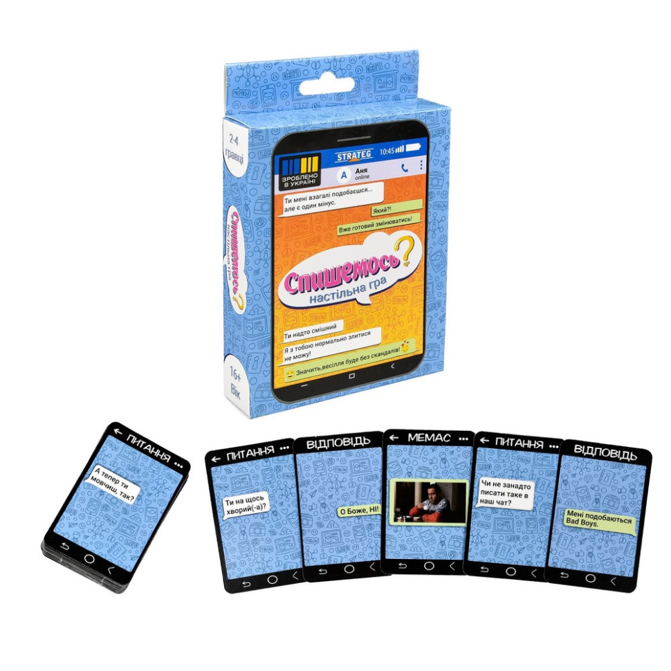 «Спишемось?» — комедийно-романтическая игра для пары или компании. Игроки разыгрывают забавные диалоги, узнают друг друга и весело проводят время.В наборе — 55 карточек и инструкция.От 2 игроков, старше 16 лет.Идеально подходит для вечеринок, свиданий и дружеских встреч.Размер коробки: 14,1 х 9,3 х 2,3 см.Комплектация: коробка, 55 карточек, инструкция.