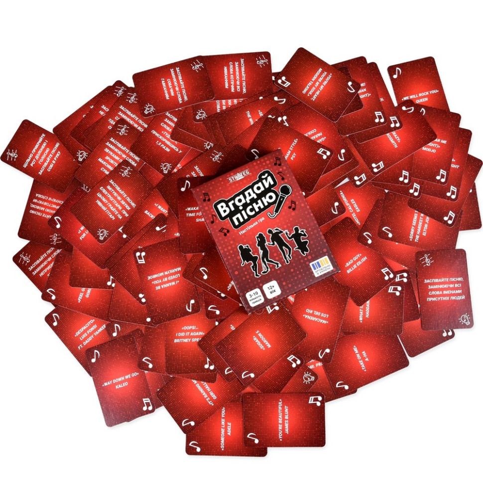«Угадай песню» — веселая настольная игра-викторина, которая превращает любую компанию в настоящее караоке-шоу. Один игрок получает карточку с песней и способом ее исполнения, а остальные должны догадаться, что именно он поет. Но не все так просто — способы исполнения могут существенно усложнить задачу: придется петь, например, не открывая рта или заменяя все слова кошачьим мяуканьем.Игра разжигает смех, креатив и музыкальный азарт. Она идеально подходит для шумных компаний, вечеринок, семейного досуга, тимбилдинга и всех меломанов.И небольшая просьба: если играете в заведении, старайтесь не петь слишком громко — иначе рискуете вызвать зависть у соседей.Возраст: 12+Количество игроков: 3-10Размер коробки: 14 х 10 х 2,5 смВес: 165 г