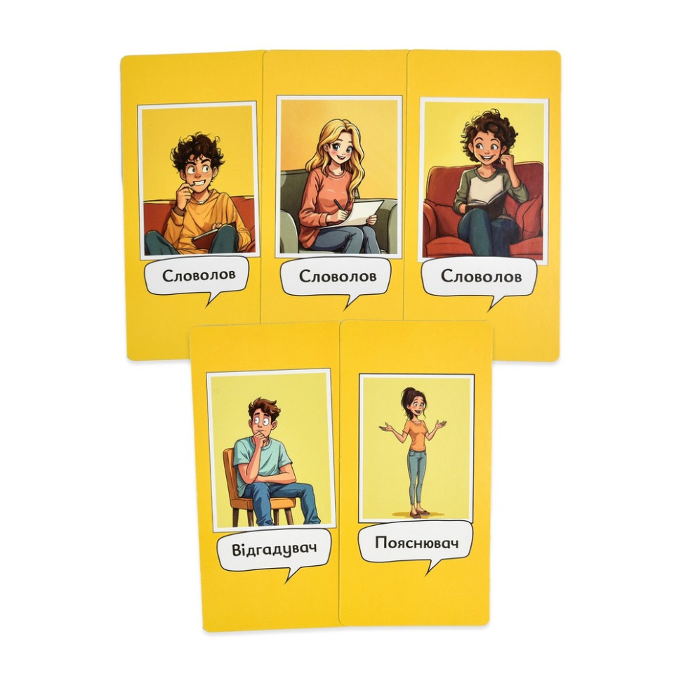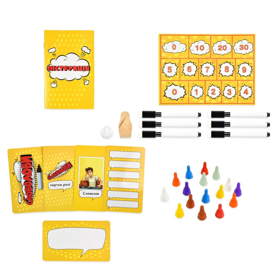 «Словоловы» – настольная игра для компании на объяснение слов. Придумывающий загадывает слово, словоловы пытаются предсказать, какие слова могут прозвучать во время объяснения, объясняющий толкует, а отгадывающий ищет ответ. Подходит для вечеринок, тимбилдингов и семейного досуга.♦ Возраст: 12+♦ Комплектация: коробка, карточки ролей – 8 шт., карточки для написания – 6 шт., маркеры – 6 шт., игровое поле, фишки – 16 шт., фишка первого игрока, подставка, инструкция.