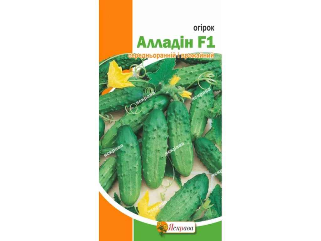 Гібридний сорт огірка Аладін F1 дозріває за 45 днів і підходить для вирощування у відкритому ґрунті безрозсадним способом. Його рівномірні середньогорбкуваті зеленці відрізняються ніжним смаком, відсутністю гіркоти і хрусткістю. Врожайність сорту висока - до 5 кг з 1 м²,посадка насіння у відкритий ґрунт - у травні,збір врожаю - у липні.Схильності до переростання і жовтіння немає