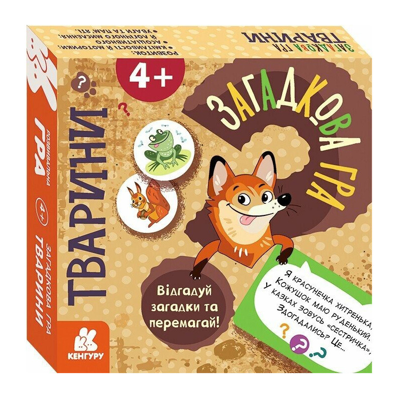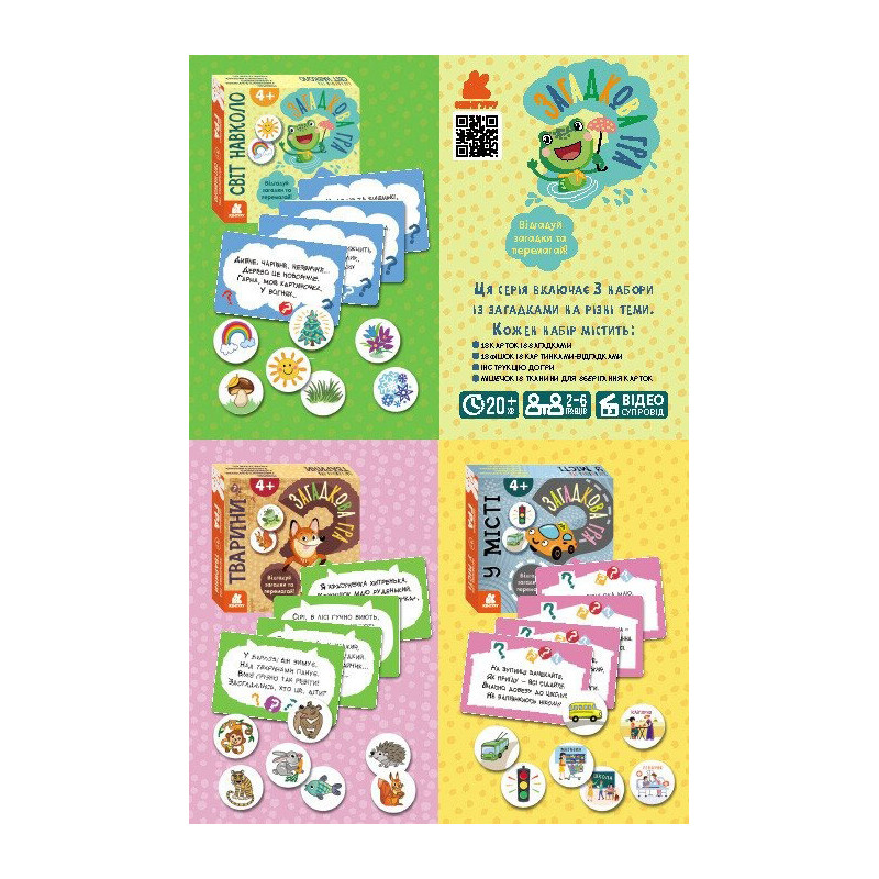 Не секрет, что почти все любят загадки! Поэтому добавили игру, которая заинтересует малышей и поможет взрослым организовать для них увлекательный и полезный досуг.Каждый набор содержит карты и фишки. На каждой карте есть стихотворная загадка, которую детям предлагается разгадать. И это еще не всё! Ребёнок должен не только дать правильный ответ, но и отыскать фишку с соответствующим изображением.Эта игра способствует всестороннему развитию детишек, ведь она включает много задач: необходимо воспринять на слух загадку (а в более старшем возрасте можно прочесть ее самостоятельно); придумать отгадку; найти фишку с подходящим рисунком и быстренько ее схватить. Так что эта игра поможет развить речевые и когнитивные способности ребенка, внимательность и ловкость.«Загадочная игра» предполагает возможность варьировать правила. Вы всегда можете добавить свои! Например, предложите ребенку, который первым нашел фишку с отгадкой, рассказать что-нибудь об этом предмете или существе (если это животное: чем он отличается от других, если какой-то предмет: где его можно увидеть или для чего он существует и т.п.). Главное, помните: ребенку это должно быть в радость!