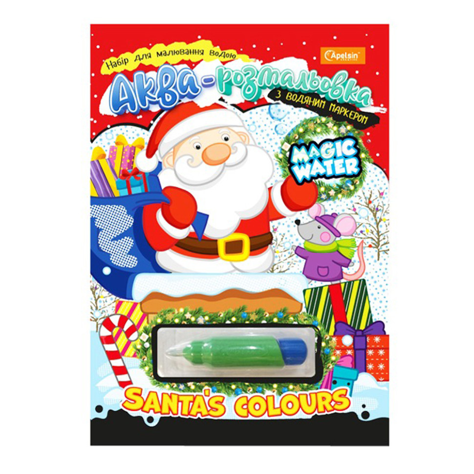 Набор для рисования водой «Magic Water» ЗИМНЯЯ СЕРИЯ с волшебным водным маркером — это настоящее зимнее чудо, которое подарит ребенку праздничное настроение и магию творчества!Достаточно лишь набрать обычную воду в маркер и провести им по страницам — иллюстрации постепенно «оживают», появляются яркие цвета, а знакомые рождественские персонажи приобретают краски.В каждой раскраске — тематические зимние сюжеты: Санта, елки, подарки, снеговики и другие хорошо знакомые малышам рождественские герои.Большие изображения с четкими толстыми контурами созданы специально для маленьких художников.Рисовать просто, безопасно и очень интересно!Идеально подходит для путешествий, праздничных дней или уютных вечеров дома. Это отличный вариант для рождественского подарка, который точно принесет радость и пользу.Формат/размер: А4Количество страниц: 8Обложка и скрепление: целлюлозный картон 250 г/м2, цветная печать, глянцевая ламинация;скрепление скобой + водный маркер в блистере.Блок: бумага офсетная 150 г/м2, печать водными красками.Язык: украинский, английскийВес: 125 г