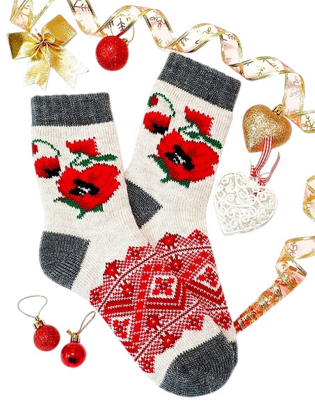 Шкарпетки жіночі високі, в'язані, 100% вовна, 35-40р. (маки+орнамент)