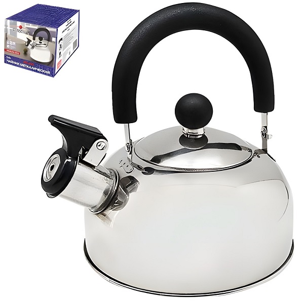 Чайник із нержавіючої сталі 1,4л зі свистком,чорна ручка, одинарне дно STENSON
