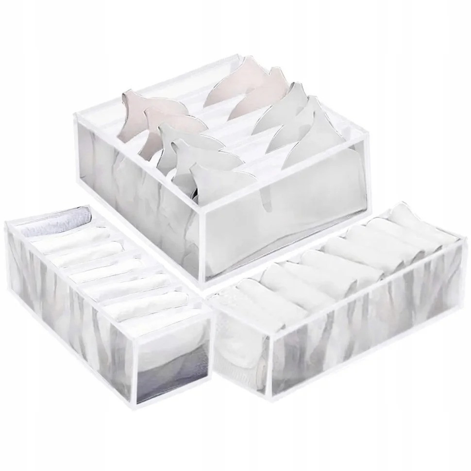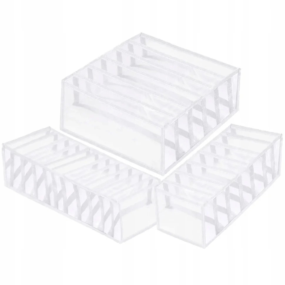 В набор входит большой органайзер размером 32 x 32 x 12 см разделен на 6 секций и два меньших, размером 32 x 12 x 12 см на 7 и 11 секций. Изделие выполнено из нейлоновой сетки, материал не впитывает запахов, что делает его чрезвычайно гигиеничным. Органайзеры очень легкие, благодаря чему они просты и удобны в перемещении. Классические цвета прекрасно впишутся в любой шкаф или гардероб и однозначно не испортят общий интерьер.