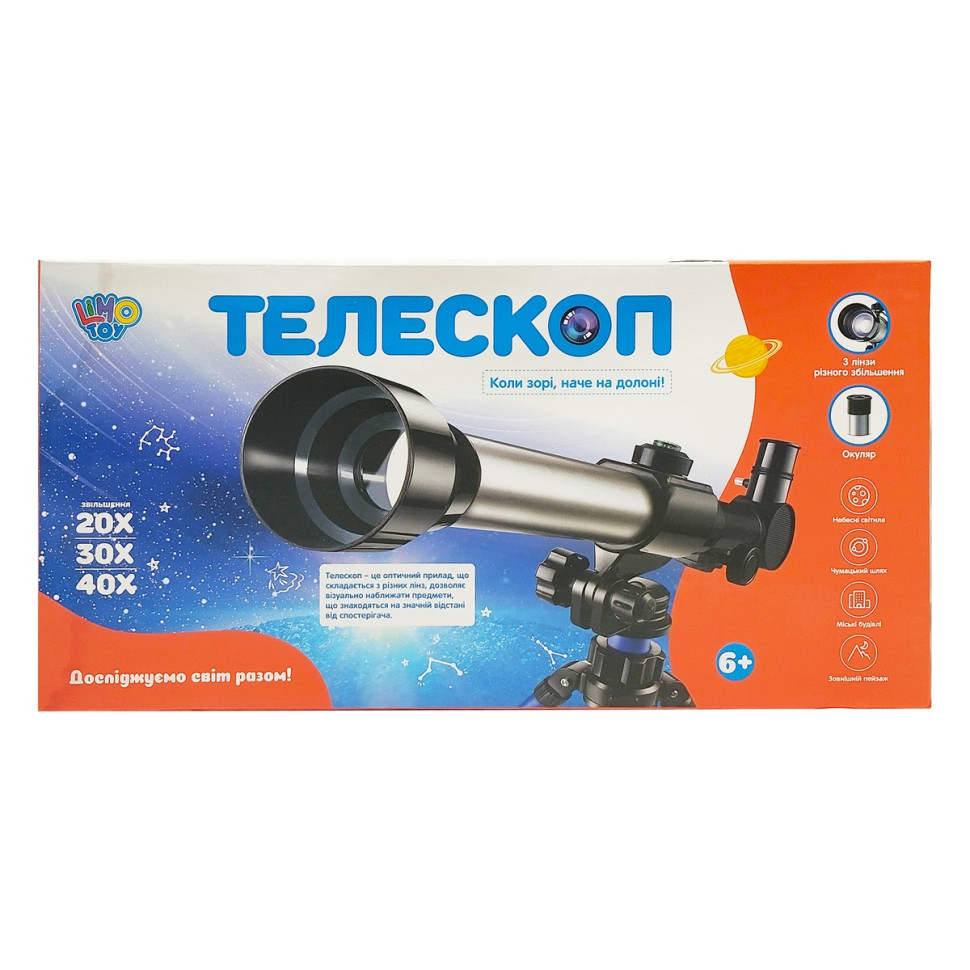 Этот телескоп станет отличным подарком для юных исследователей, которые мечтают открывать новые горизонты и познавать окружающий мир. Игрушка поможет ребёнку почувствовать себя настоящим астрономом или путешественником, развивает любознательность, воображение и интерес к науке.Телескоп оснащён несколькими уровнями увеличения, что позволяет рассматривать объекты на разном расстоянии. Удобный штатив обеспечивает устойчивость во время наблюдений, а компас поможет ориентироваться на местности.Характеристики и комплектация:- длина телескопа: 40,5 см- увеличение: 20×, 30×, 40×- штатив: 34 см- компасИдеально подходит для познавательных игр, активного досуга и первых научных открытий.