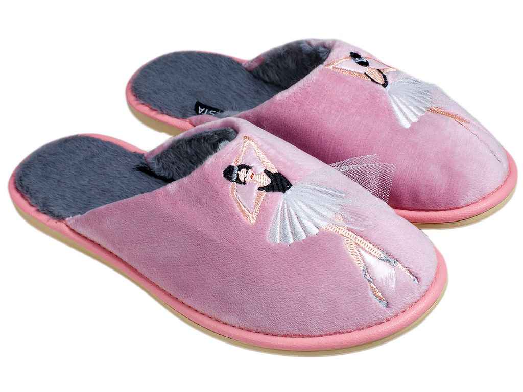 Елегантні жіночі домашні капці від виробника БЕЛСТА зроблені з мякого велюру. Взуття прикрашене машинною вишивкою у вигляді Балерини. Устілка зроблена з еко хутра. Модель підходить для носіння у холодний період.