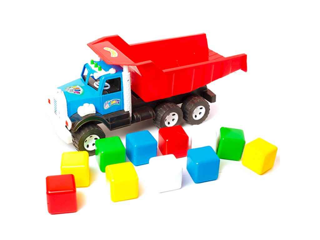 Набір дитячий “Фарго кубики малі” – це набір з 11 кубиків та вантажівки. Основний елемент – це іграшковий самоскид із яскравою кабіною, чорними колесами та великим, відкідним кузовом. Самоскид також має шість коліс, що робить його стійким. У набір входять 11 кубиків , розміром 6*6 см.