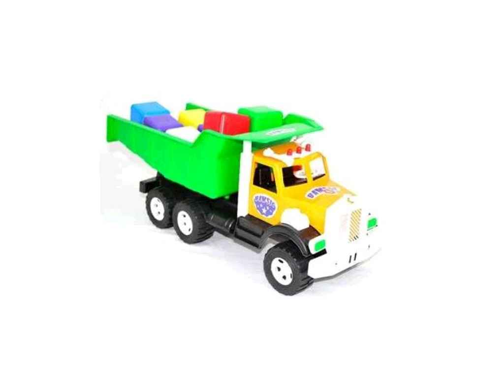 Набір дитячий “Фарго кубики малі” – це набір з 11 кубиків та вантажівки. Основний елемент – це іграшковий самоскид із яскравою кабіною, чорними колесами та великим, відкідним кузовом. Самоскид також має шість коліс, що робить його стійким. У набір входять 11 кубиків , розміром 6*6 см.