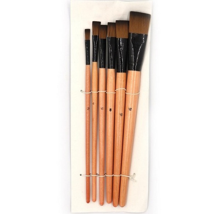 Универсальный набор плоских кистей из синтетического волокна (нейлона), который станет незаменимым инструментом как для профессиональных художников, так и для начинающих или учеников художественных школ. Плоская форма пучка идеально подходит для нанесения широких равномерных мазков, закрашивания фона и создания четких контуров.