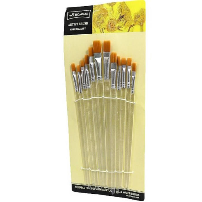 Универсальный набор плоских кистей из синтетического волокна (нейлона), который станет незаменимым инструментом как для профессиональных художников, так и для начинающих или учеников художественных школ. Плоская форма пучка идеально подходит для нанесения широких равномерных мазков, закрашивания фона и создания четких контуров.