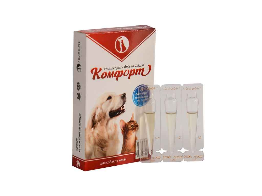 Краплі інсекто-акарицидні Коти, собаки Комфорт проти бліх та кліщів 3 ампули по 1мл ТМПродукт