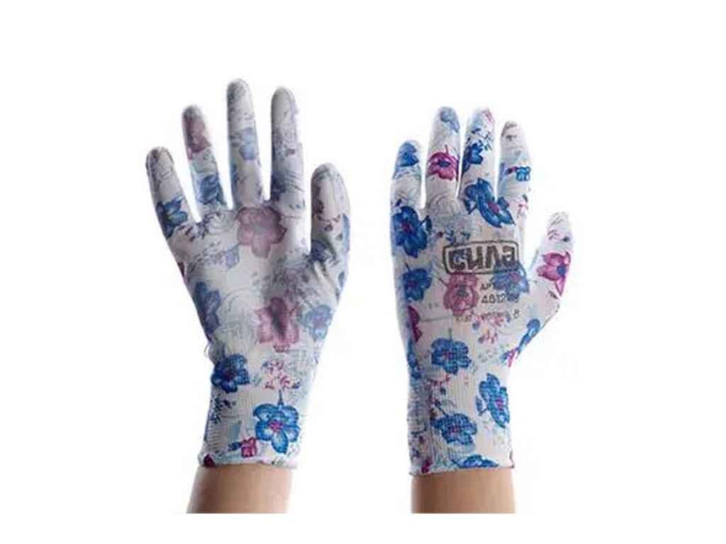 Перчатки робочі з поліуретановим покриттям 8(M) трикотажні НЕЗАБУДКИ (блакитні садові манжет без підвіса/хедера) ТМ СИЛА