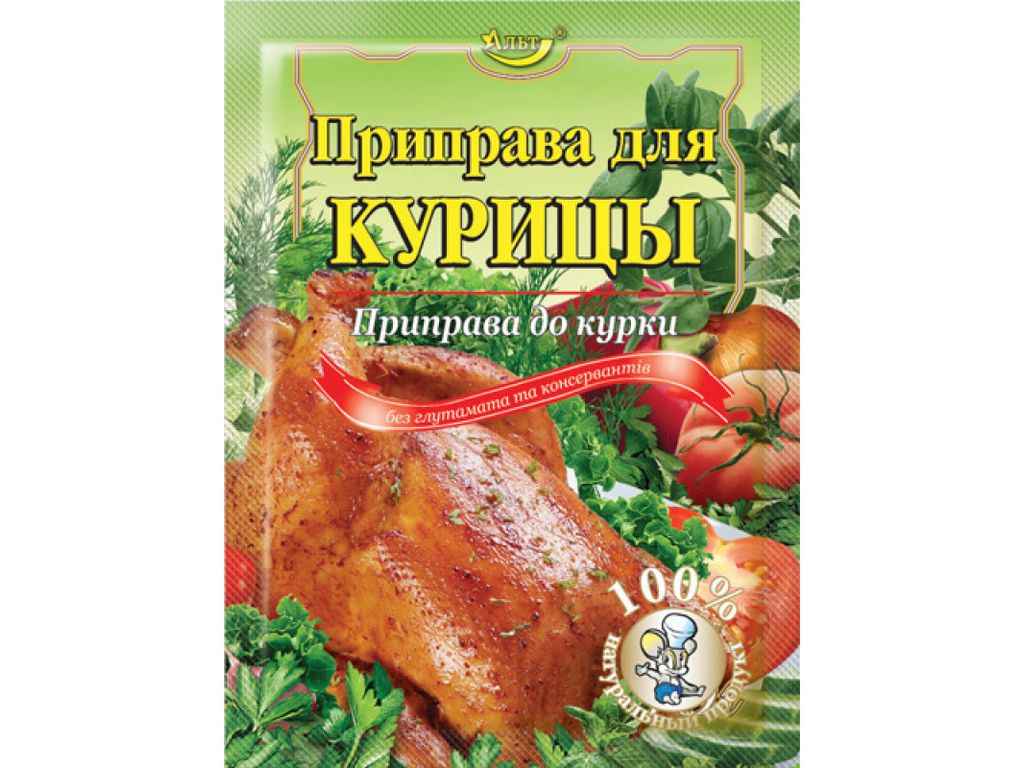 Суміш пряно-ароматична. Оригінальна суміш спецій, прянощів та сушених овочів, яка розроблена на основі традиційних рецептів. Приправа є невідємним компонентом приготування страв з курки і додається до смаку. Вона надає страві ніжного, вишуканого смаку та аромату, зберігає мясо соковитим під час приготування. Приправу можна використовувати для маринування, запікання, смаження мяса, а також приготування соусів.