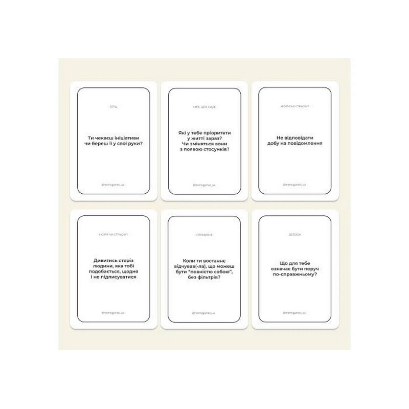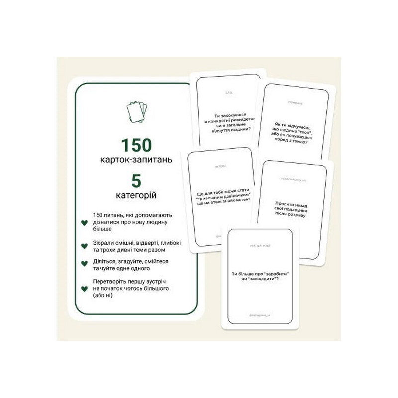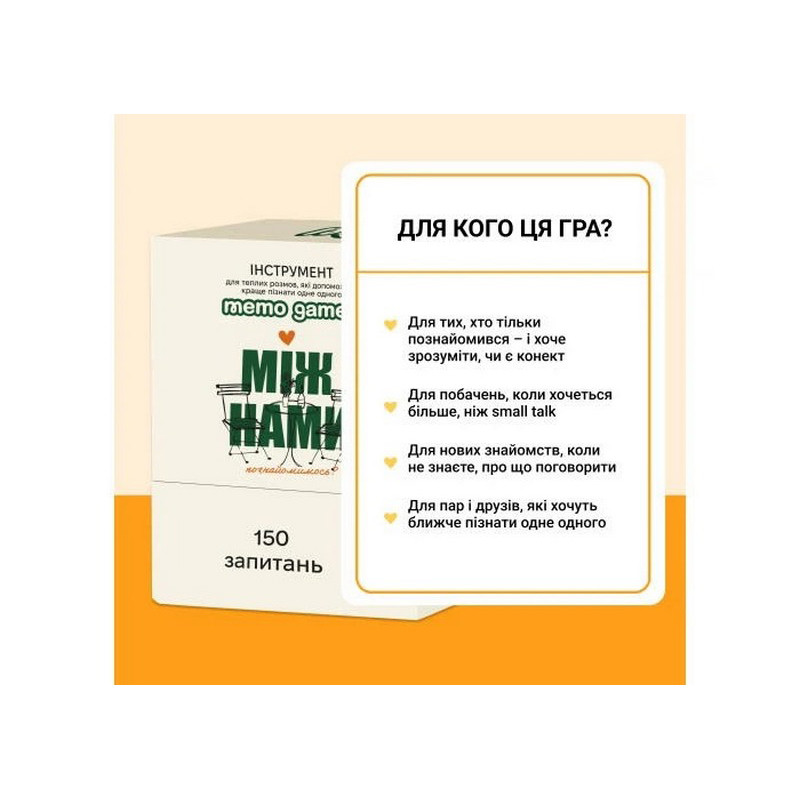 НЕ ЗНАЕТЕ, С ЧЕГО НАЧАТЬ РАЗГОВОР?Эта игра – универсальный ключ к каждому человеку.Внутри есть 150 карточек, которые помогут сделать разговор живым, интересным и настоящим. Все, что нужно – это вытащить карточку, прочитать вопрос и узнать что-то важное о человеке рядом (и о себе).Реальные преимуществаИГРА, КОТОРАЯ СНИМАЕТ НАПРЯЖЕНИЕ НА ПЕРВОЙ ВСТРЕЧЕМы собрали несколько основных причин, почему эту игру так любят брать на первые свидания3 шага успешной игрыПРОСТОЙ СПОСОБ УСЛЫШАТЬ ДРУГ ДРУГАПросто вытащите карточку и позвольте разговору произойтиimage01. Создайте комфортную атмосферуНайдите уютное место и настройтесь на разговор.02. Перемешайте карточки или выберите категориюИграйте так, как вам удобно именно сейчас.03. Тяните карточку и отвечайте искреннеГоворите, слушайте, смейтесь и знакомьтесь поближе.