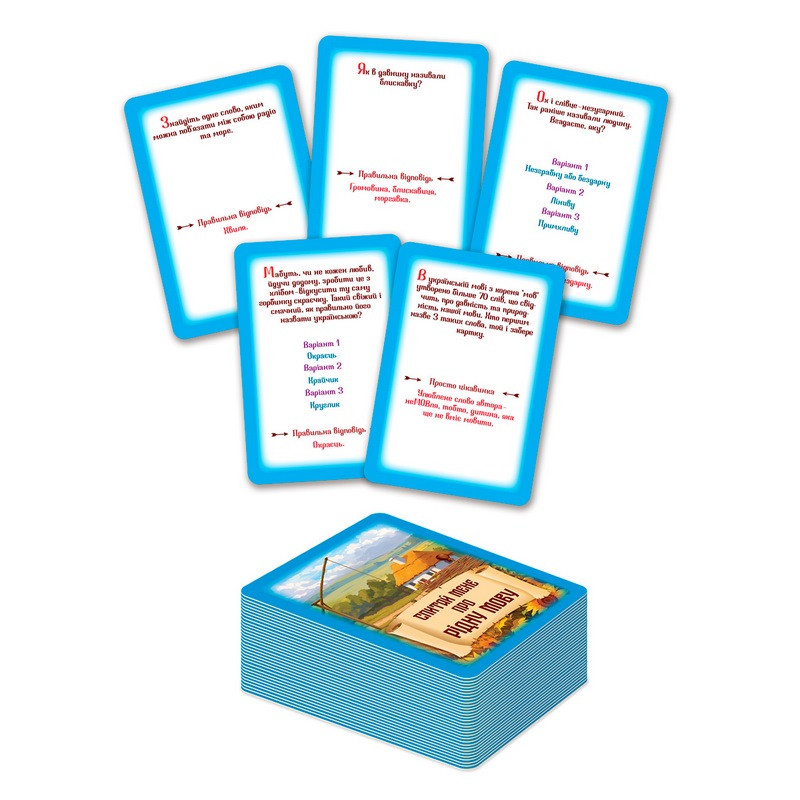 "Спроси меня о родном языке" - незабываемая языковая викторина, которая перенесёт вас сквозь пространство и время к нашему языковому наследию. Проверьте свою эрудицию и узнайте, насколько глубоко вы чувствуете пульс родного языка, открывая для себя его интересные особенности.В коробке вас ждут 50 карточек с загадками, которые превратят вечер в интеллектуальное соревнование. Игроки ходят по очереди: в свой ход вы берёте карточку и зачитываете задание. Ваши соперники наперегонки дают правильный ответ. Самый сообразительный участник, который первым разгадает загадку, забирает карточку себе. Ваша цель - собрать наибольшее количество карточек и стать победителем среди ценителей украинского языка.Игра отлично подходит как для двух, так и для 3-8 игроков. Поэтому открывайте коробку, задавайте вопросы друзьям и докажите, что украинский язык - это ваша суперсила и источник бесконечного вдохновения!Количество игроков: 2-8.Продолжительность игры: 30-60 минут.Комплектация: 50 карточек, правила игры.