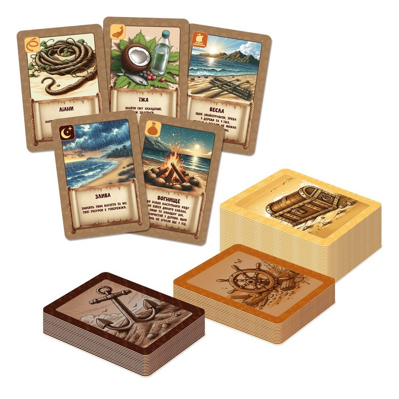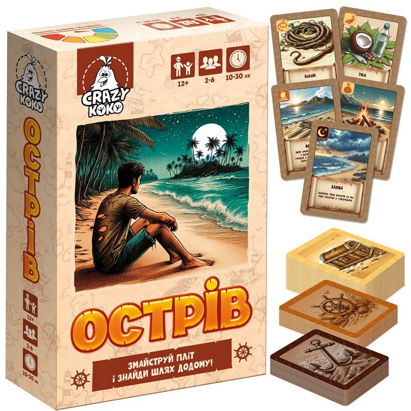 "Остров" - приключенческая настольная игра о выживании и возвращении домой с таинственного клочка суши.После шторма вы оказываетесь на необитаемом острове, окружённом безбрежным океаном. Единственный путь домой - построить плот и весла и решиться на побег. Для этого придётся собирать ресурсы: древесину, лианы и еду.Во время игры вы постепенно накапливаете необходимые ресурсы, но остров скрывает множество опасностей. Неожиданные события, ночные угрозы, ливни и хищные животные могут разрушить ваши планы. Чтобы выжить, нужно поддерживать огонь, строить укрытия и запасаться грибами как противоядиями.Побеждает тот, кто первым построит плот и весла и покинет остров. Для азартной компании возможен вариант игры до последнего игрока - когда остров покинут все, кроме одного.Хватит ли вам хитрости, выдержки и удачи, чтобы первым покинуть остров? Играйте и проверьте свои силы!Количество игроков: 2-6.Продолжительность игры: 10-30 минут.Комплектация: 100 карточек, правила игры.