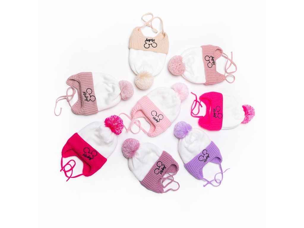 Шапка в’язана на зав’язках з вишивкою Mickey і помпоном