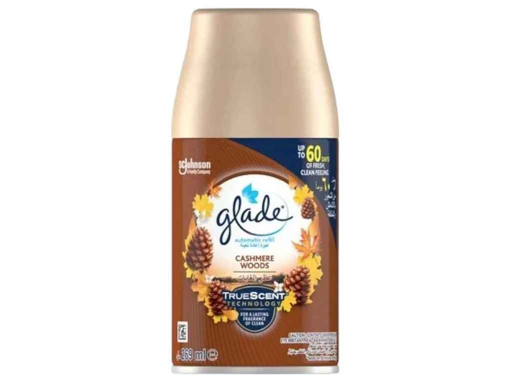 Змінний балон Glade для автоматичного освіжувача повітря з ароматом «Ніжність кашеміру і сандал». Призначений для заміни у відповідних автоматичних диспенсерах Glade. Забезпечує безперервне розповсюдження приємного аромату та ефективно освіжає повітря у приміщенні, нейтралізуючи неприємні запахи. Обєм балона становить 269 мл.