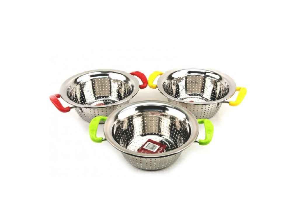 Друшляк 20 см для промивання макаронних виробів, миття фруктів, сушки, проціджування і пасерування овочів. Виготовлений з першокласної нержавіючої сталі.Ручкі з металу, покриті пластиком.