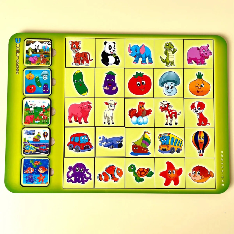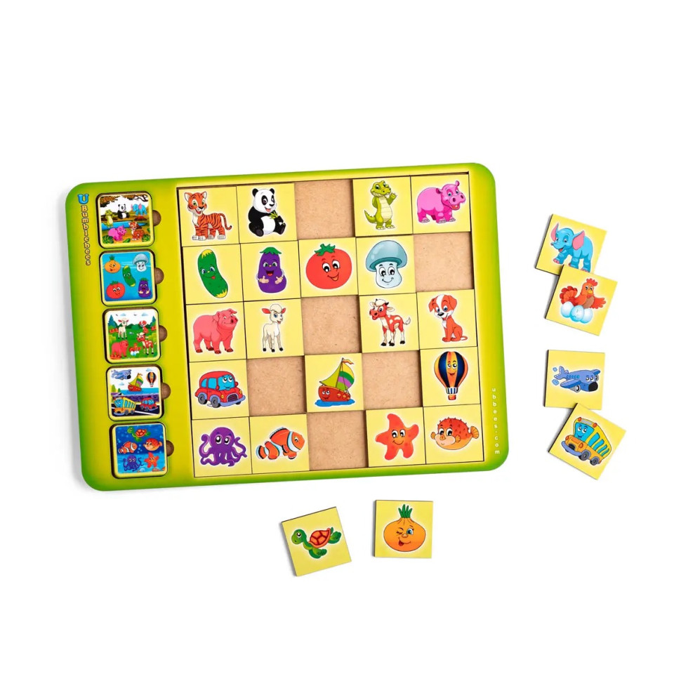 25 фишек с предметами из разных сфер (животные, транспорт, еда, морские обитатели и т. д.).