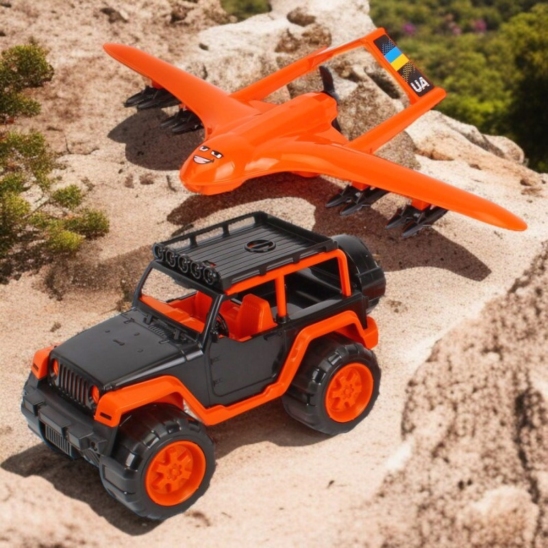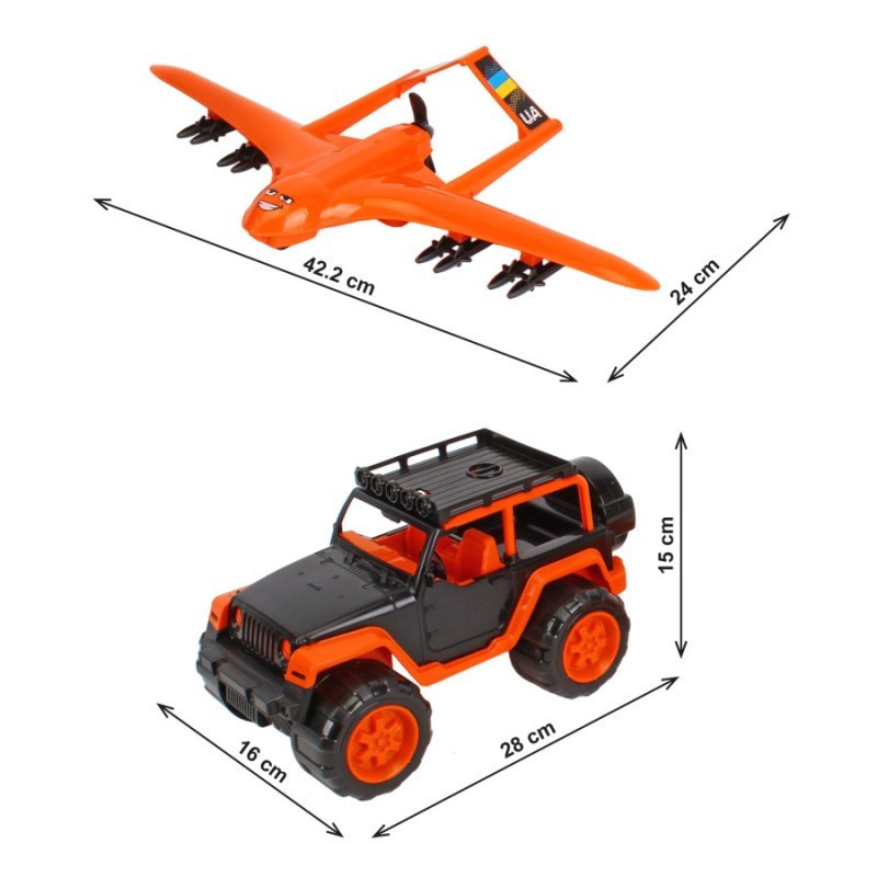 Подарите своему ребенку незабываемые приключения с игрушечным "Набором транспорта".Этот яркий и реалистичный внедорожник станет любимой игрушкой маленьких любителей приключений! Его стильный дизайн и функциональные элементы приведут в восторг молодого исследователя.Открытый кузов: Удобно размещать игрушечных пассажиров для совместных поездок.Большой багажный отсек: Вместительное пространство для перевозки важных "грузов".Высокий клиренс: Обеспечивает отличную проходимость на любой игровой местности.Детализированный салон: Реалистичный руль и сиденье для более увлекательной игры.Беспилотник:Стильная модель, напоминающая известный Байрактар, идеальна для маленьких защитников и ловких пилотов! Реалистичный дизайн с патриотическими наклейками.Ракеты на корпусе беспилотника: Для отражения атак и защиты неба.Колеса: Для быстрого старта и умелой посадки.Прочность и надежность: Изготовлен из высококачественного пластика.Развитие воображения: Поощряет сюжетно-ролевые игры и фантазию.