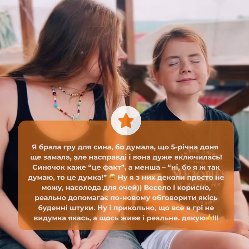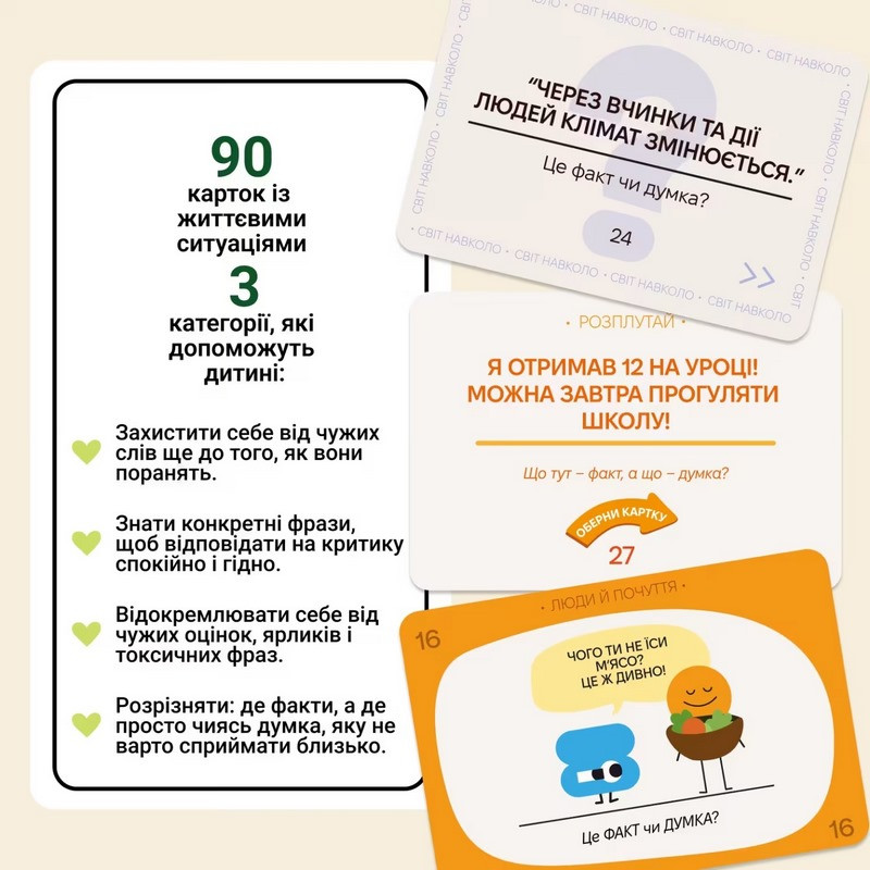 КАЖДОЕ СЛОВО ВЛИЯЕТ НА ВАШЕГО РЕБЕНКАФразы типа «Ты странный» или «У тебя плохо получилось» могут оставить след надолго.«ФАКТ или МНЕНИЕ?» - это игра, которая учит ребенка не принимать чужие слова как истину.Внутри коробки – 3 категории, которые развивают ключевые навыки:МИР ВОКРУГ: тренирует распознавание фактов и мнений в повседневных ситуацияхЛЮДИ И ЧУВСТВА: учит реагировать на неконструктивную критику спокойно и уверенноРАЗВЯЖИ УЗЛ: помогает анализировать сложные суждения и не поддаваться манипуляциямреальные преимущества90 СИТУАЦИЙ, КОТОРЫЕ ИЗМЕНЯТ ДЕТСКОЕ МЫШЛЕНИЕС этой игрой ребенок научится видеть суть, а не просто верить каждому слову3 шага успешной игрыКАК ИГРАТЬ В «ФАКТ ИЛИ МНЕНИЕ?»Приготовьтесь к получению крутых эмоций01. Прочитайте текст на карточке или покажите ее другимВыберите одну из трех категорий. Прочитайте фразу или рассмотрите ситуацию на карточке вместе.02. Определите: это ФАКТ или МНЕНИЕ?Обсудите: это факт, который можно проверить, или это просто чья-то оценка?Добавьте объяснение – почему именно так.03. Найдите смысл и ответПроверьте правильный ответ на обратной стороне.Обсудите вместе, как реагировать мудро, уверенно и без обид.