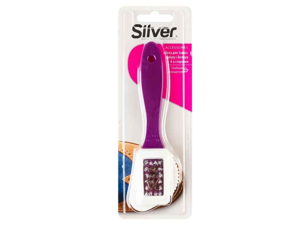 Щітка для взуття Silver для нубуку та замші 4-стороння. Комбінована 4-стороння щітка для делікатного чищення виробів з нубуку та замші. Багатофункціональна, легко видаляє пил і забруднення, освіжає поверхню. Склад: поліпропілен, каучук.