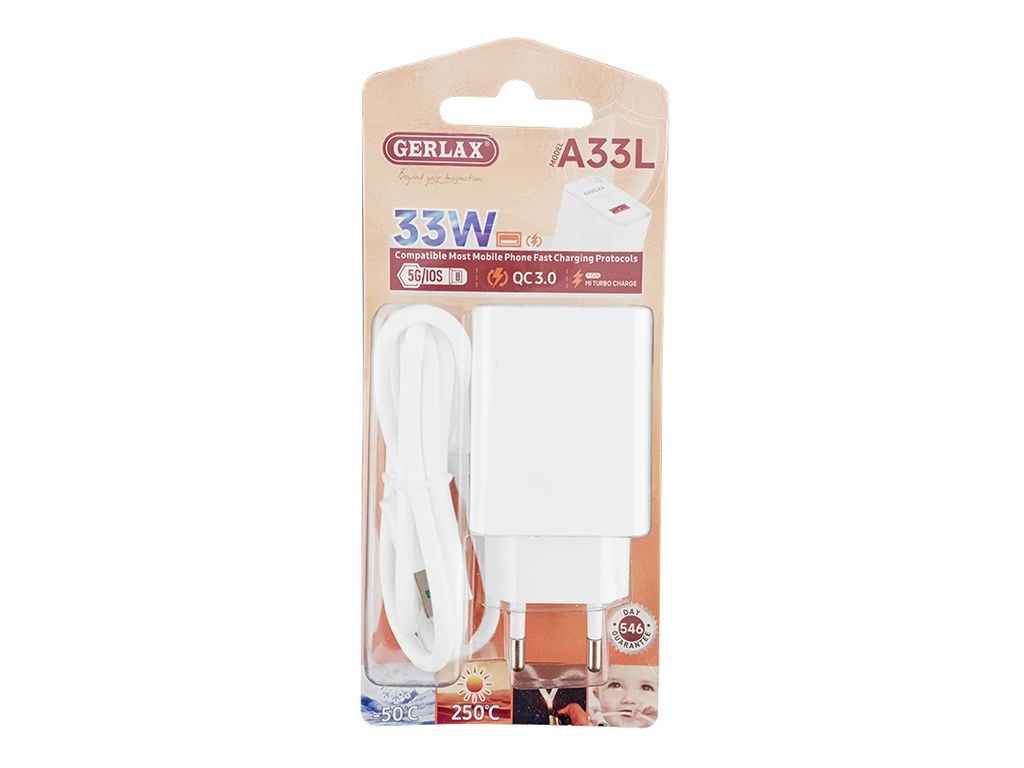 Мережевий зарядний пристрій для iPhone Lightning A33L 3A/1USB/33W/QC3.0 кабель силіконовий білий 1м ТМ GERLAX