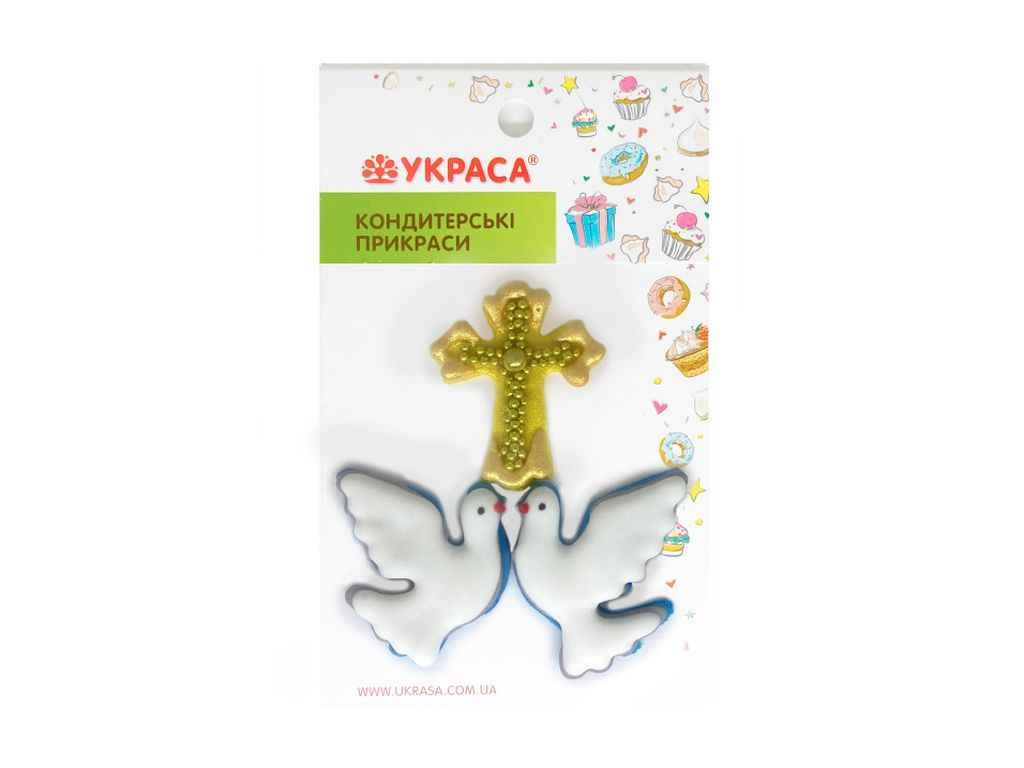 Набір пасхальних кондитерських прикрас Два голуби з хрестиком виготовлений з цукрової пасти та білкової маси, зображає два окремі голуби та християнський хрестик оздоблений золотими кульками. Майстерне виконання прикраси додасть оригінальності пасхальному виробу, також прикраса легко поєднується з іншим пасхальним та кондитерським декором, солодкими кондитерськими посипками.
