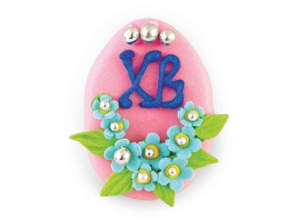Кондитерські прикраси - це кондитерські вироби ручної роботи, призначені для швидкого декорування поверхні великодньої паски.Склад: цукор білий, патока, яєчний білок, жир рослинний (олії пальмова та соняшникова частково гідрогенізовані, емульгатор (Е471), антиоксидант (Е320, Е321), глюкоза, згущувачі: гуарова камідь, трагакант, КМЦ, крохмаль кукурудзяний, регулятор кислотності лимонна кислота, ароматизатор харчовий ванільно-вершковий, барвники харчові: Е171, Е102, Е124, Е133, Е174.