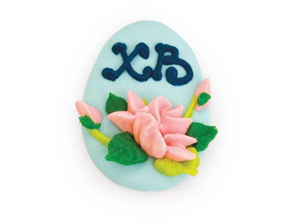 Пасхальна кондитерська прткраса Пасхальне яйце з трояндою виготовлена з білкової маси, напів обємна композиція, зображає салатове яйце, оздоблене гілочкою троянди та пасхальним вітальним написом ХВ!. Розмір виробу 35х50мм. Майстерне виконання прикраси додасть оригінальності пасхальному виробу, також прикраса легко поєднується з іншим пасхальним та кондитерським декором, солодкими кондитерськими посипками.