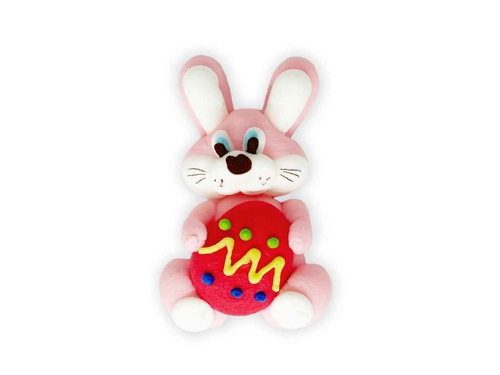 Дитяча кондитерсика прикраса Пасхальний зайчик виготовлена з білкової маси, розмір виробу 50х40мм. Композиція виробу зображає напівобємну фігурку зайчика з червоною крашанкою в лапках. Добрий дитячий сюжет та майстерне виконання прикраси додасть оригінальності пасхальному виробу, адже прикраса легко поєднується з іншим кондитерським декором: квітами, грибочками та солодкими кондитерськими посипками.