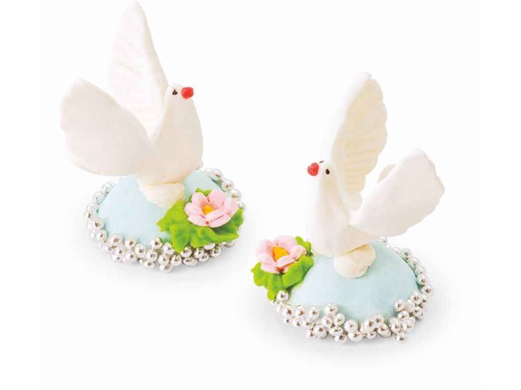 Кондитерська прикраса Голуби виготовлена з цукрової пасти та білкової маси, містить два голуби на блакитній основі оздобленій срібними цукровими кульками. Висота виробу Н35мм, діаметр Ø35мм. Окрему увагу, в композиції, привертає ретельне та майстерне виконання прикрас. Набір ідеально поєднується з різними солодкими квітами та цукровими посипками.