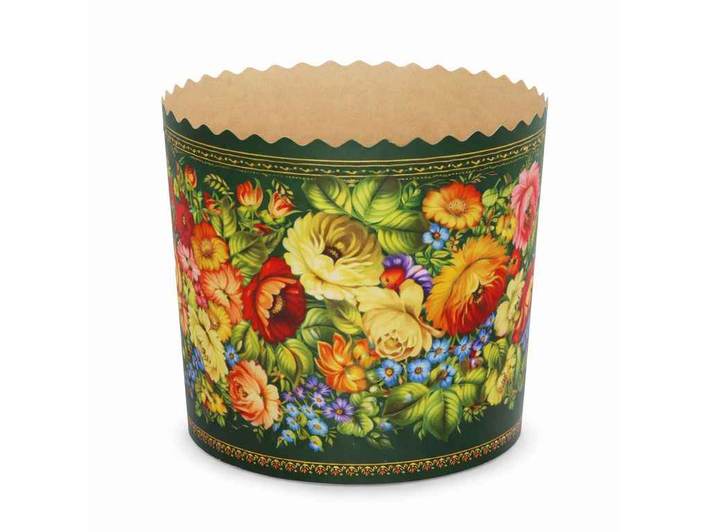 Форми виготовлені з жиростійкого пергаментного паперу, перфорація стінок. Повноколірний друк виконаний харчовими фарбами. Дно виготовлено з двохшарового, жиростійкого,перфорованого матеріалу.Діамерт дна 90мм.Висота 85мм. Вага готового виробу 250грам. В упаковці 5 штук в одному дизайні