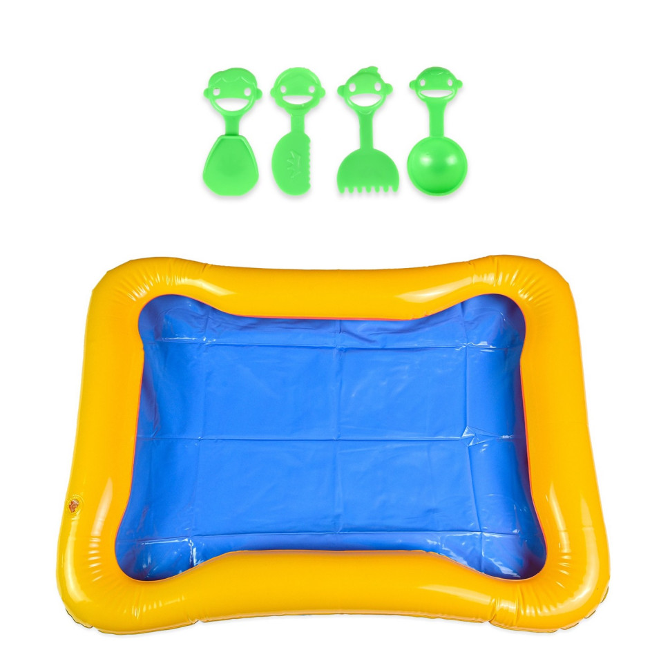 Комплектация: упаковка (изготовлена из полиэтилена), формочки для песка - 5 шт. (изготовлены из пластика), песочница (изготовлена из резины), лопаточки - 4 шт. (изготовлены из пластика).