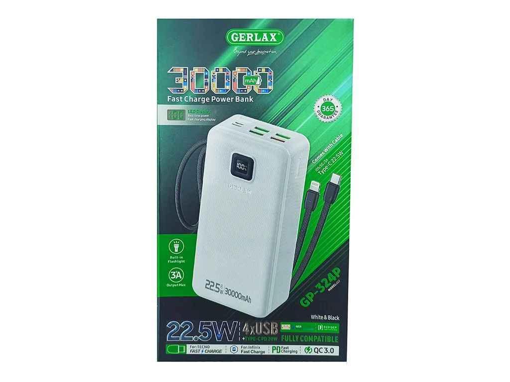 Power Bank 30000mAh GP-324P 4USB/3A/PD20W/22.5W/QC3.0/фонарик/LED дисплей/кабель 2в1 (Type-C/Lightning) чорний ТМ GERLAX