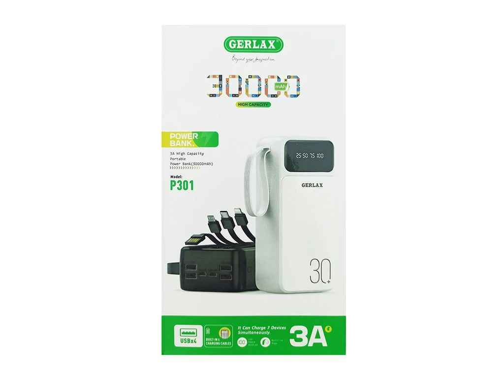 Power Bank 30000mAh P301 3A/4USB/LED дисплей/кабель 3в1 (microUSB/type-C/lightning) білий ТМ GERLAX