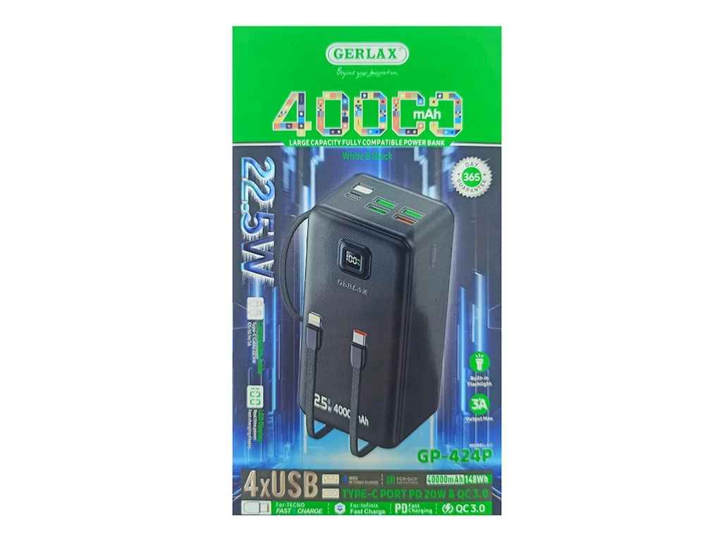 Power Bank 40000mAh GP-424P 4USB/3A/PD20W/22.5W/QC3.0/фонарик/LED дисплей/кабель 2в1 (Type-C/Lightning) чорний ТМ GERLAX