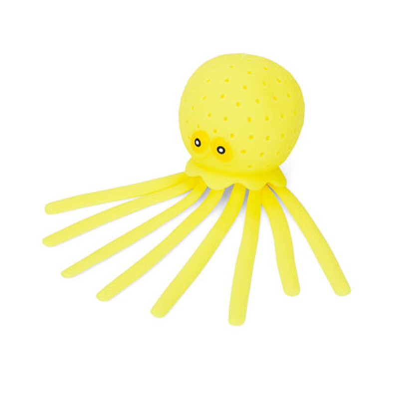 Особенность игрушки в том, что если опустить её в воду и сжать - вода набирается внутрь. А при сжимании на воздухе можно наблюдать забавный фонтанчик, который льётся из маленьких отверстий на теле осьминога.