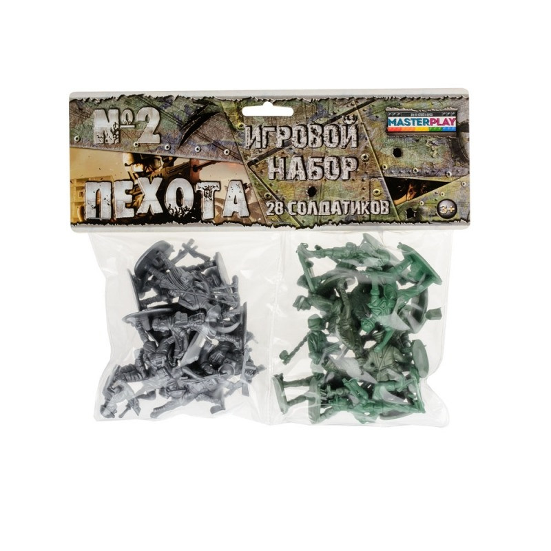 Солдатики "Пехота" No2 - большой набор игрушечных фигурок солдат-пехотинцев станет замечательным подарком для мальчика от 3-х лет и старше. Ведь, без сомнения, каждый мальчишка с самого раннего детства видит себя отважным воином и благородным рыцарем, защитником маленьких и слабых.А какие захватывающие сражения и талантливо продуманные военные кампании можно разыгрывать со своими друзьями как дома, так и на улице, где стенки песочницы становятся непреодолимой преградой, а горка камней — неприступной башней!Пластиковые фигурки солдат, а их 28, изготовлены с тщательностью и вниманием к мельчайшим деталям. Пластик высокого качества, долговечен и безопасен для детей.Игрушечные солдатики долгое время будут радовать своего владельца, не теряя своих внешних качеств.