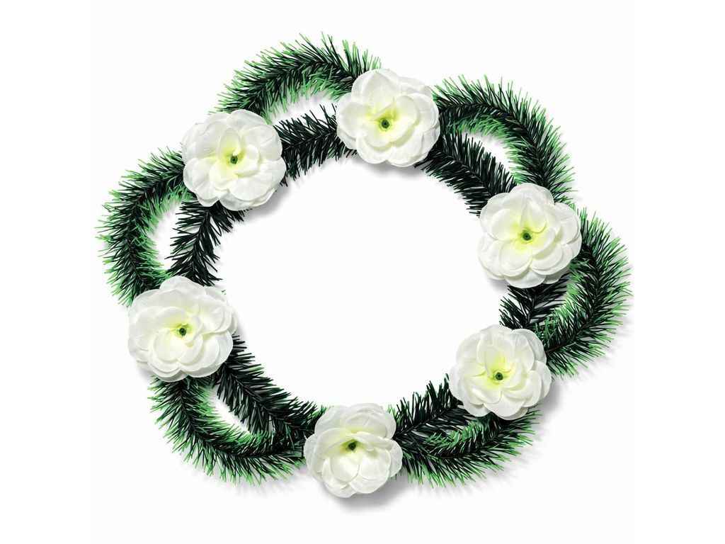 Вінок виготовлений з якісних матеріалів — прикрашений штучними квітами, це забезпечує охайний вигляд і довговічність. Кожна композиція продумана до деталей: гармонійне поєднання кольорів, акуратне оформлення.