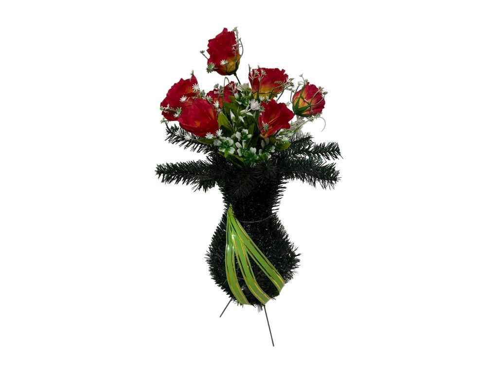 Ваза з квітами «Троянди» — це витончена композиція, що поєднує стриманість, гідність та глибоку символіку пам’яті. Виріб оформлений у класичному стилі з декоративною хвойною основою та композицією троянд, які символізують повагу, любов і світлу пам’ять. Квіти гармонійно поєднані з зеленим листям, а декоративна стрічка додає завершеності та акуратного вигляду. Композиція підходить для покладання на могилу, участі в похоронній церемонії або в поминальні дні.