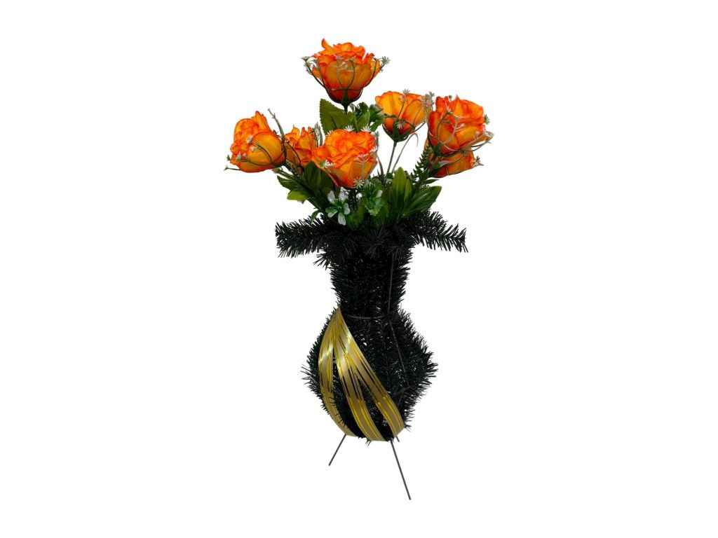 Ваза з квітами «Троянди» — це витончена композиція, що поєднує стриманість, гідність та глибоку символіку пам’яті. Виріб оформлений у класичному стилі з декоративною хвойною основою та композицією троянд, які символізують повагу, любов і світлу пам’ять. Квіти гармонійно поєднані з зеленим листям, а декоративна стрічка додає завершеності та акуратного вигляду. Композиція підходить для покладання на могилу, участі в похоронній церемонії або в поминальні дні.