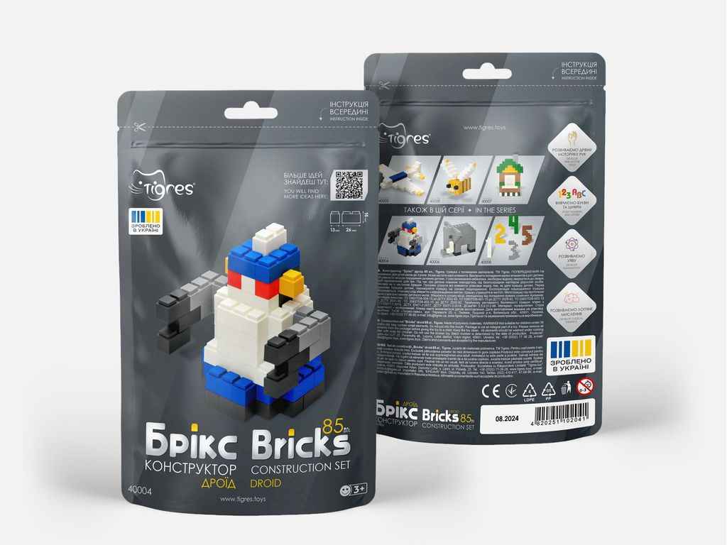 В серії Брікс 85 ел. – 6 різних кольорових наборів на будь-які вподобання хлопчиків та дівчаток – літак, дроїд, слон, бджола, будинок і цифри.