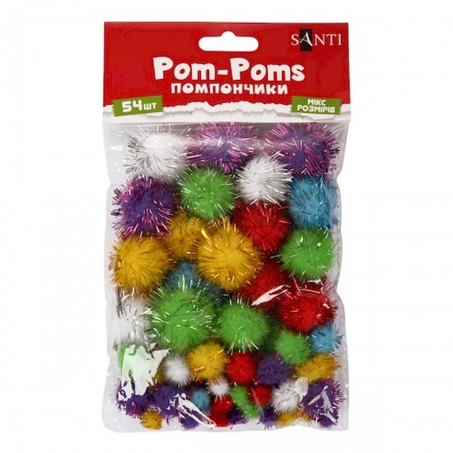 Помпоны - это мягкие шарики, изготовленные из искусственного волокна. Также отлично подойдут для любого детского творчества и занятий по раннему развитию.Помпоны ТМ SANTI очень удобны в работе, что позволяет мастеру выбрать максимально удобный способ фиксирования, например метод пришивания вручную или на машинке, задействовать термоклей или использовать липкую поверхность, накалывать на проволоку, шпажки, нанизывать на шнур и т.д. Гармонично сочетаясь с другими декоративными элементами, помпоны становятся неотъемлемой частью вашего творческого процесса.Основные характеристики аксессуаров для творчества помпоны ТМ SANTI:- материал: полипропилен- диаметр: 8, 15, 25 мм- цвет: цветные- особенность: с люрексом- комплектация: 54 шт/уп.