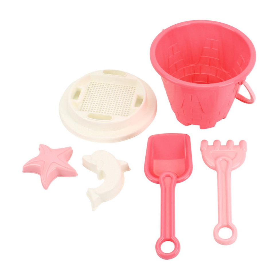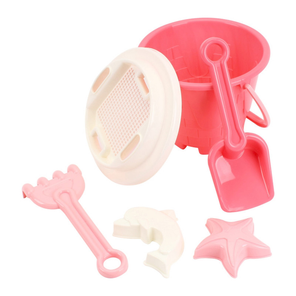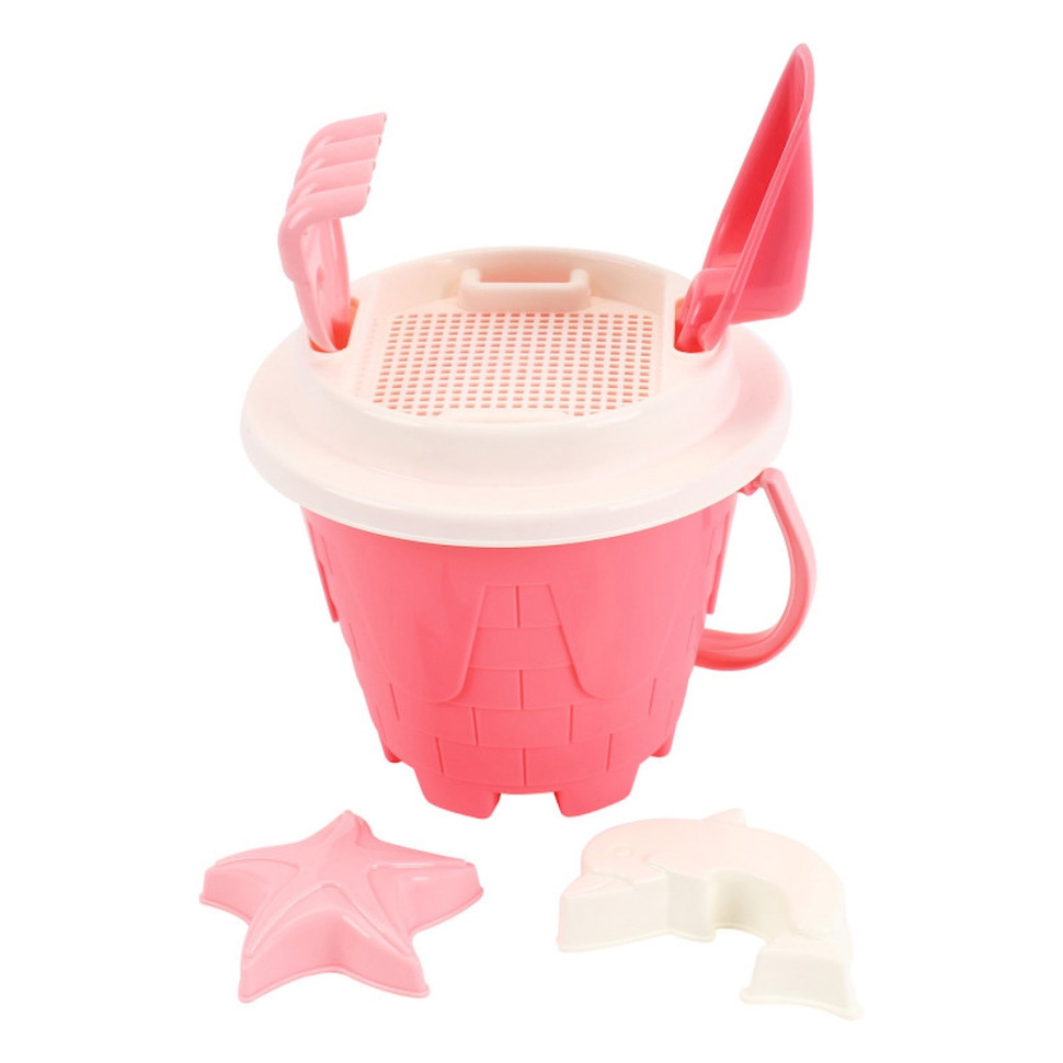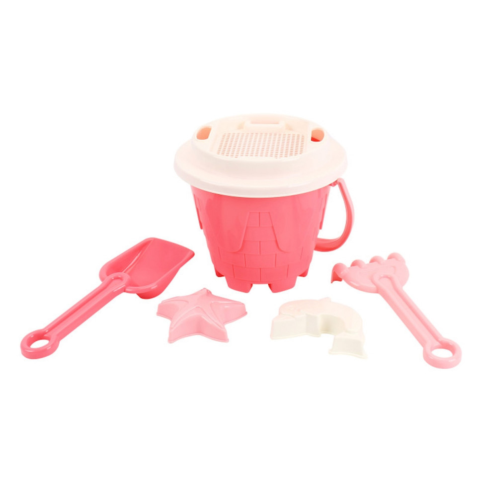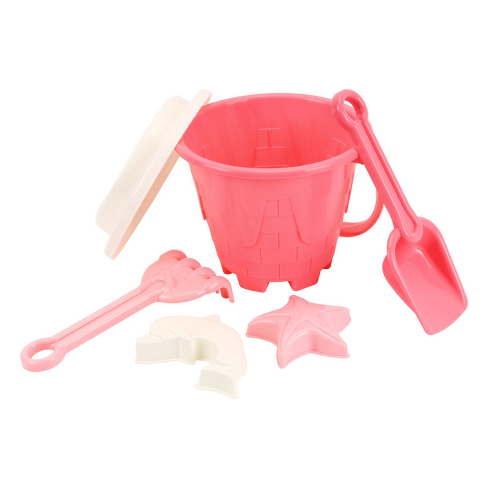 Розовая ведерко-замковая башня: Милое и крепкое ведерко, выполненное в форме сказочной замковой башни в нежных розовых оттенках. Идеально подходит для наполнения песком и водой, поощряя малышей к первым строительным экспериментам.