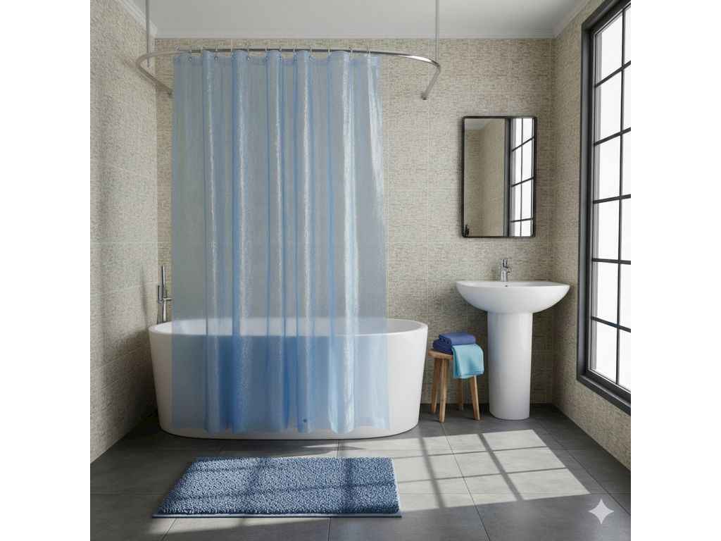 штора для душу PEVA; 90г/м2; запаяні края; з обтяжувачами; фурнітура поліпропілен 100% прозорий; 12 гачків; 12 люверсів