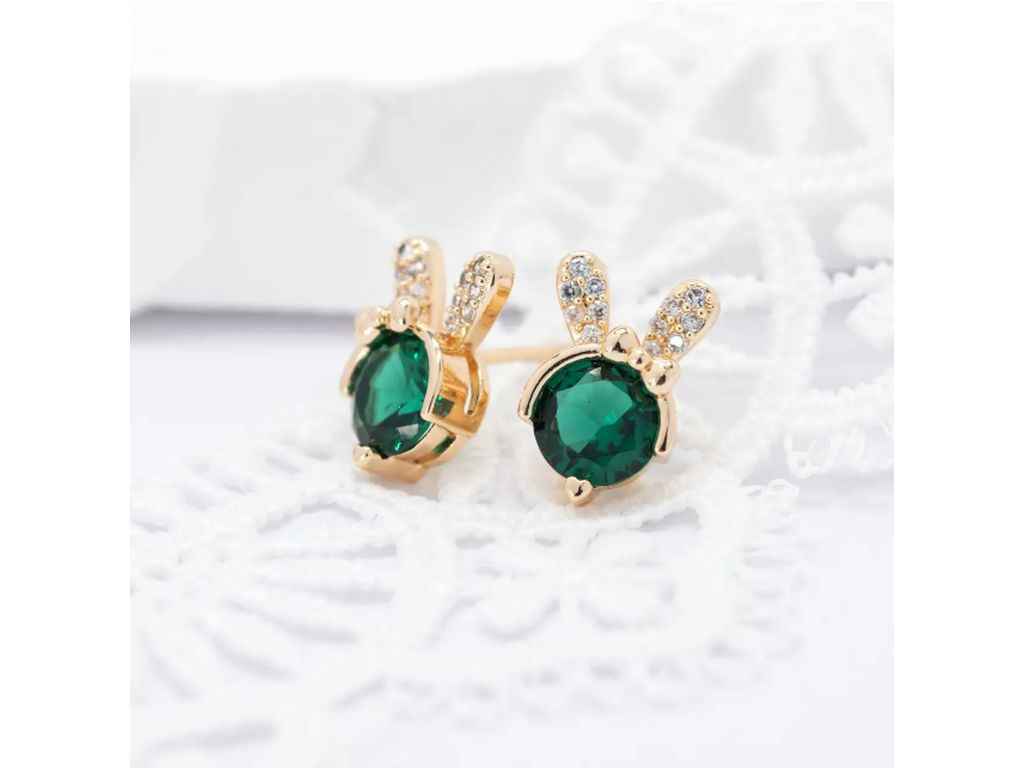 Сережки англійська застібка гвоздики Зайченя 55117 12*8мм зелені фіаніти позолота 18К ТМ XUPING